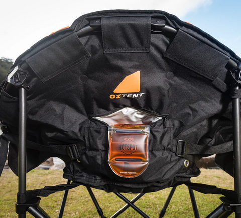 The OZTENT Koala HotSpot™ Lounge chair is the ultimate in luxury camp chairs for all seasons. It also incorporates our lumbar support system and is made with a super high quality construction using luxurious 600D diamond Ripstop polyester that is fully padded with a massive weight rating of 200Kg. You have an insulated drink and phone holder on one side and two mesh pockets on the other to store your other goodies. It also includes one HotSpot™ pouch. Then in the front we have added a hidden under seat pocket.