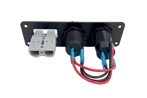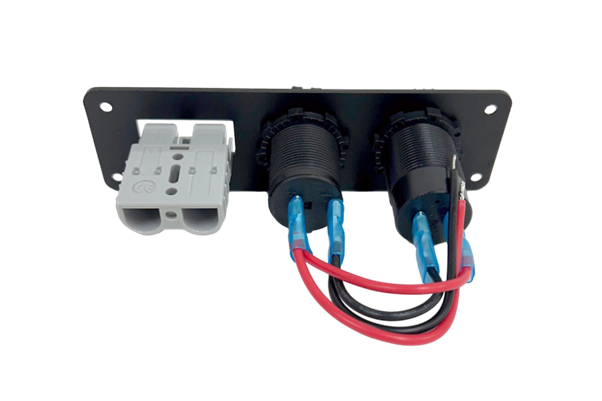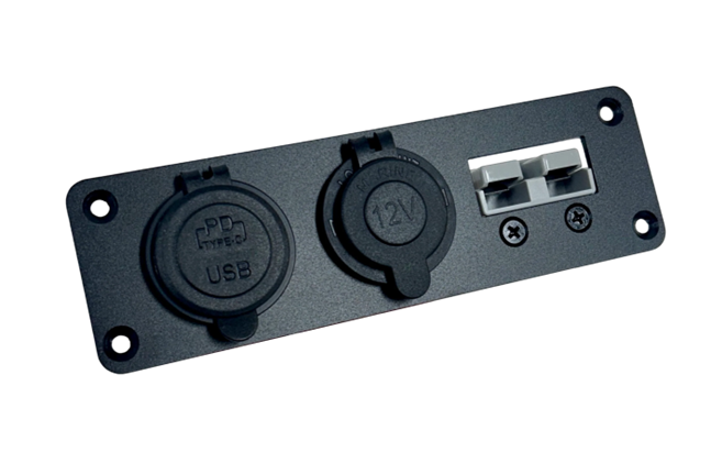 A flush mounting bracket with a recessed 50A Anderson connector, Cigarette Lighter Socket and Dual USB Charger for mounting into trims and panels.